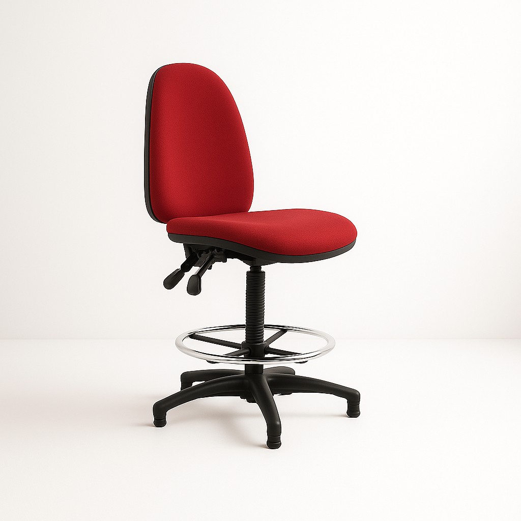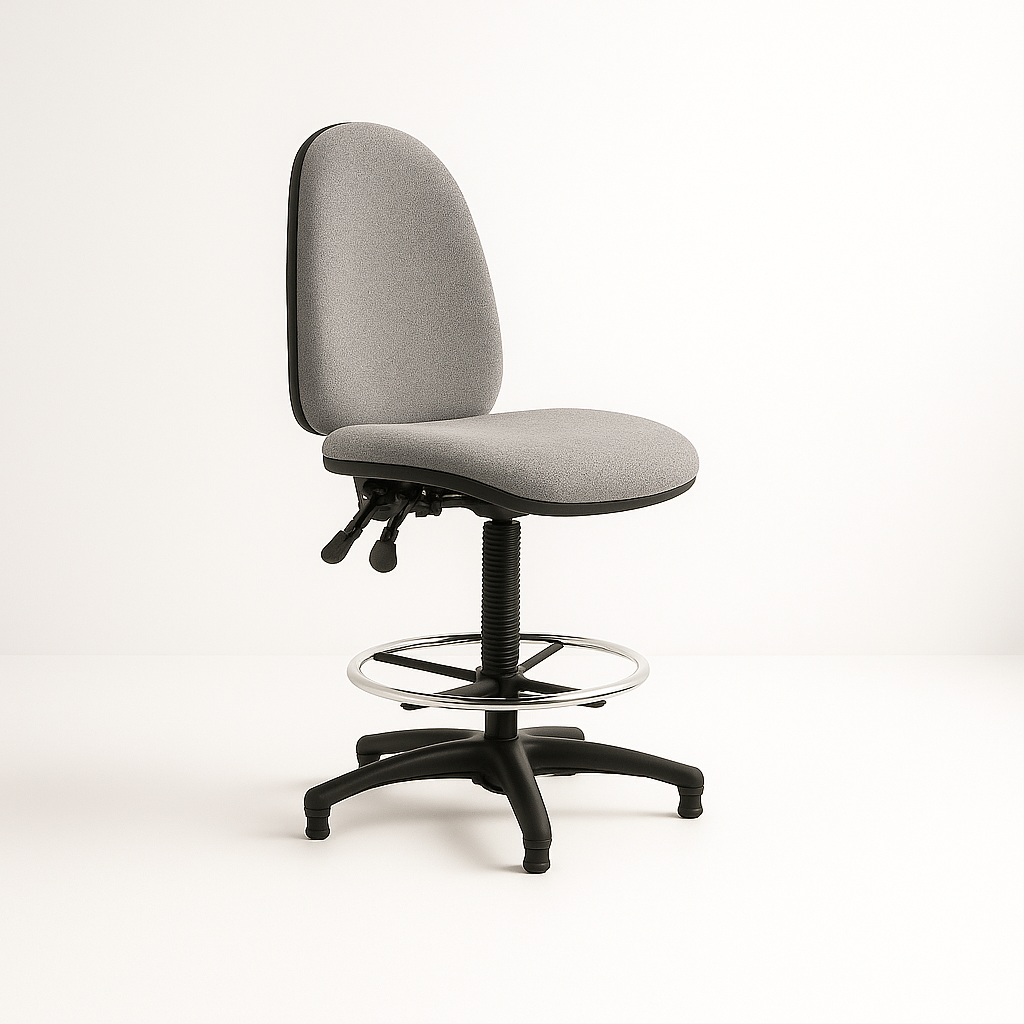 The Draughtsman's Chair we have available to rent, has a footrest, adjustable height & adjustable back. This is commonly seen in checkouts of supermarkets, but, is also used for reception desks at exhibitions & events worldwide.
