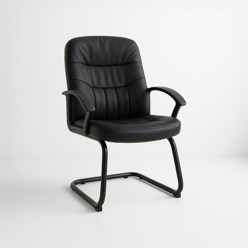 Our cantilever is made from a steel frame power coated in black. The seat is then covered in foam and recovered in black faux lever. Cantilever means that it slightly bouncy so in turn means the chairs is a very comfortable meeting chair and looks great amongst any of our conference & meeting tables.