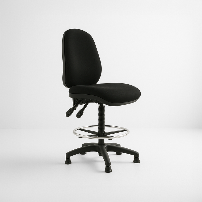 The Draughtsman's Chair we have available to rent, has a footrest, adjustable height & adjustable back. This is commonly seen in checkouts of supermarkets, but, is also used for reception desks at exhibitions & events worldwide.