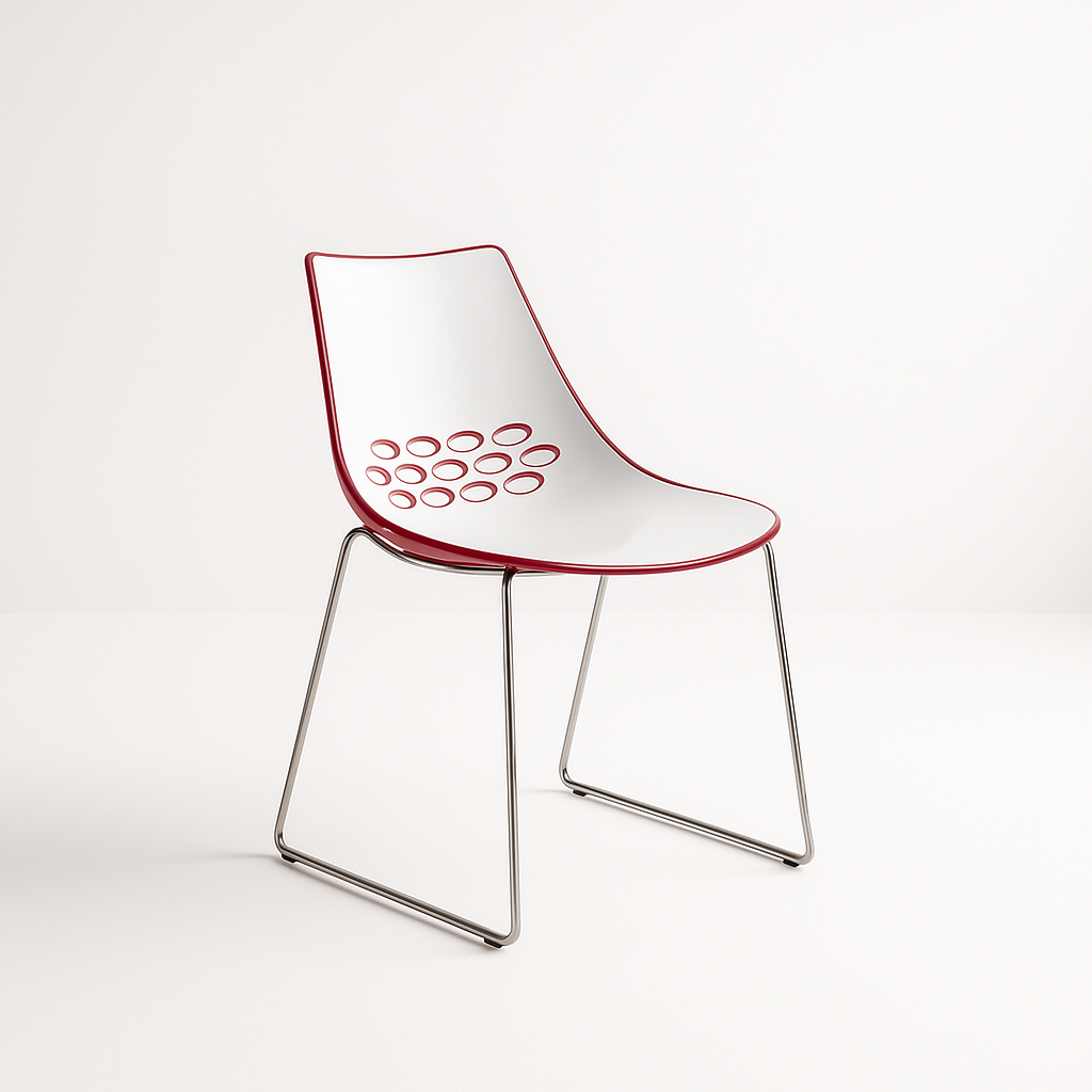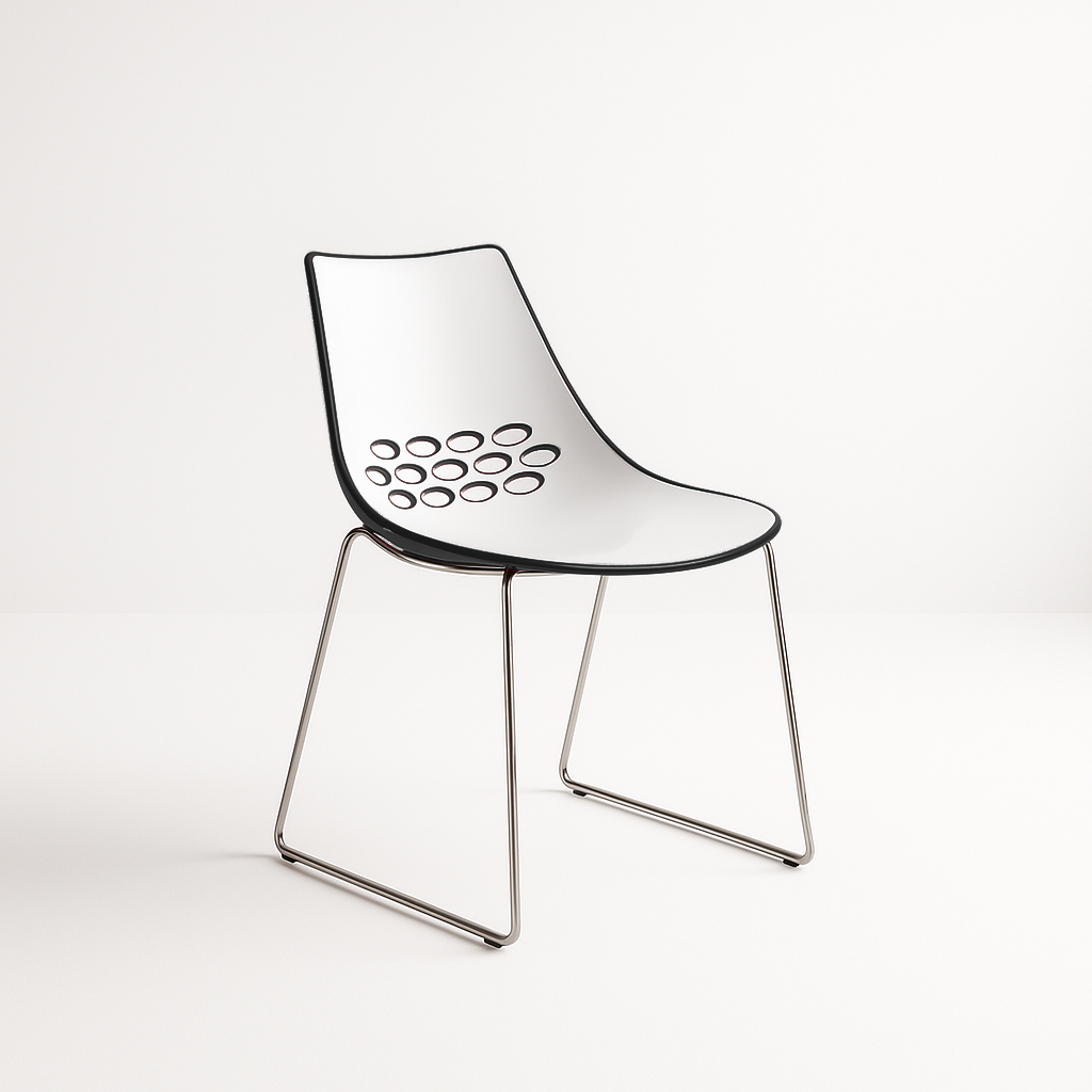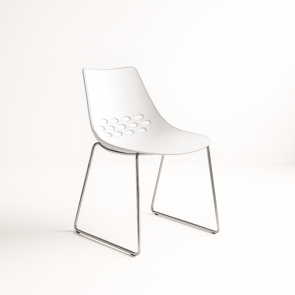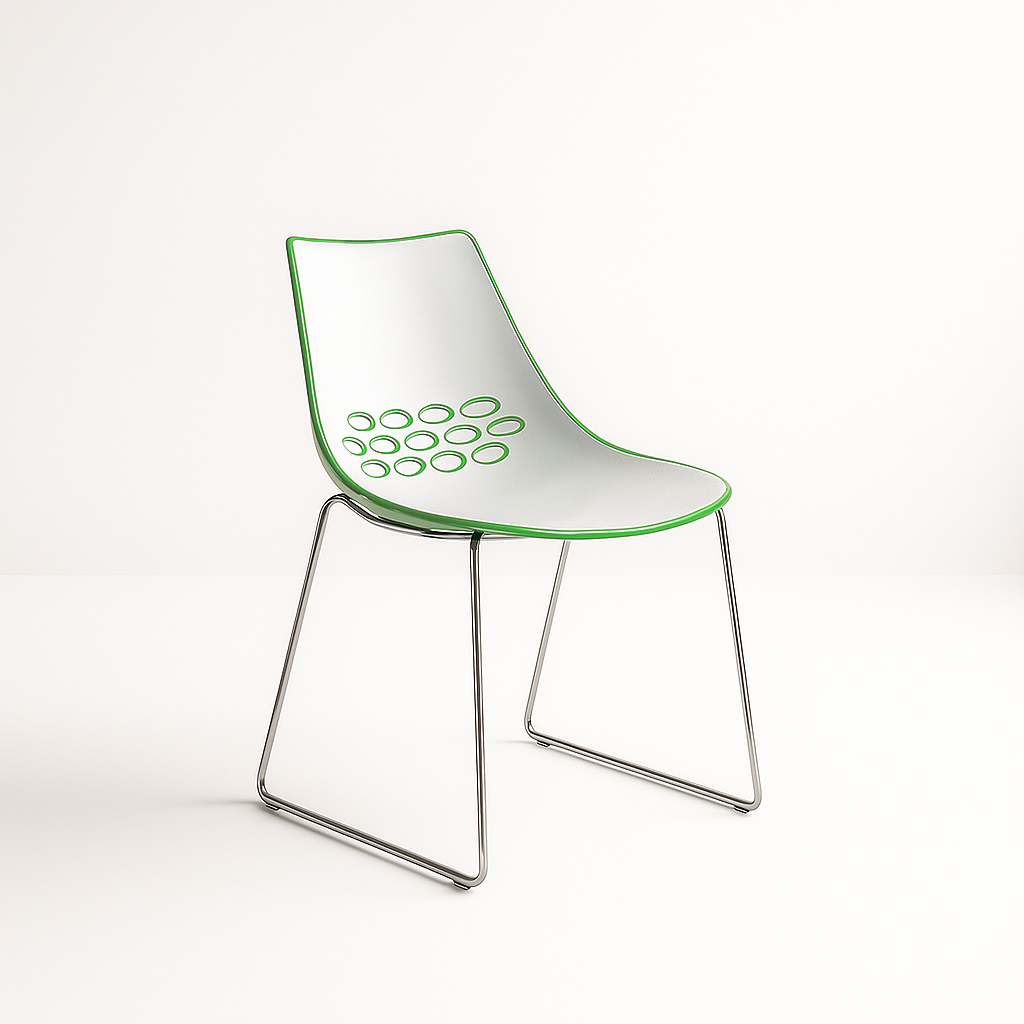 The Jam Chair is made from two techno polymer shells moulded together with 3 rows of circles cut out of the backrest. The inside of the seat is a glossy white finish with a variety of colours on the outer shell. The chair for hire has achieved great notoriety and iconic status as a design classic; it has featured on the sets of many TV shows and in the press. Whether its style or usability then this is the chair designed for you with its smooth flowing lines and superb curves it looks fantastic on any exhibition stand.