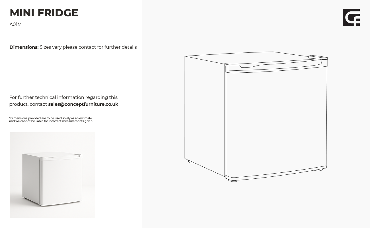 Our fridges are available in 3 variations of sizes depending on the quantity of food & drink you need to keep chilled. Our mini fridge is ideal for small exhibition stand to keep water, milk and sandwiches cold but the complete fridge is ideal for mobile catering companies which service large crowds. Dimensions & models may vary, please contact us if you require exact measurements Requires a UK 3 Pin 13 amp plug socket.